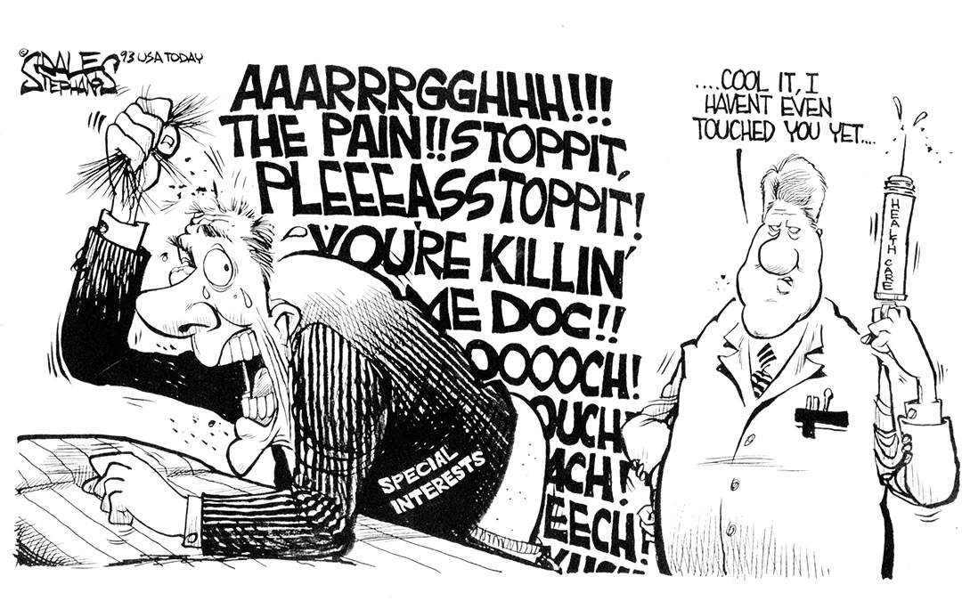After I felt I had developed a bit I started sending copies to the national papers and magazines hoping they would reprint them. Again, to my disbelief, I started getting cartoons reprinted in the New York Times, Los Angeles Times, Newsweek, Washington Post. USA Today even asked me to contribute on a regular basis! Then I got up the nerve to ask Jerry Holbert, the editorial cartoonist for the Boston Herald, to put a good word in for me and I was asked to be a regular contributor to the Herald as well. That lasted for 13 years.
